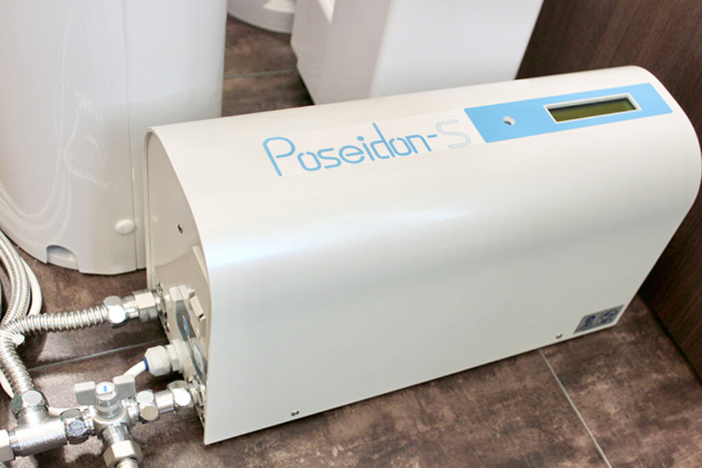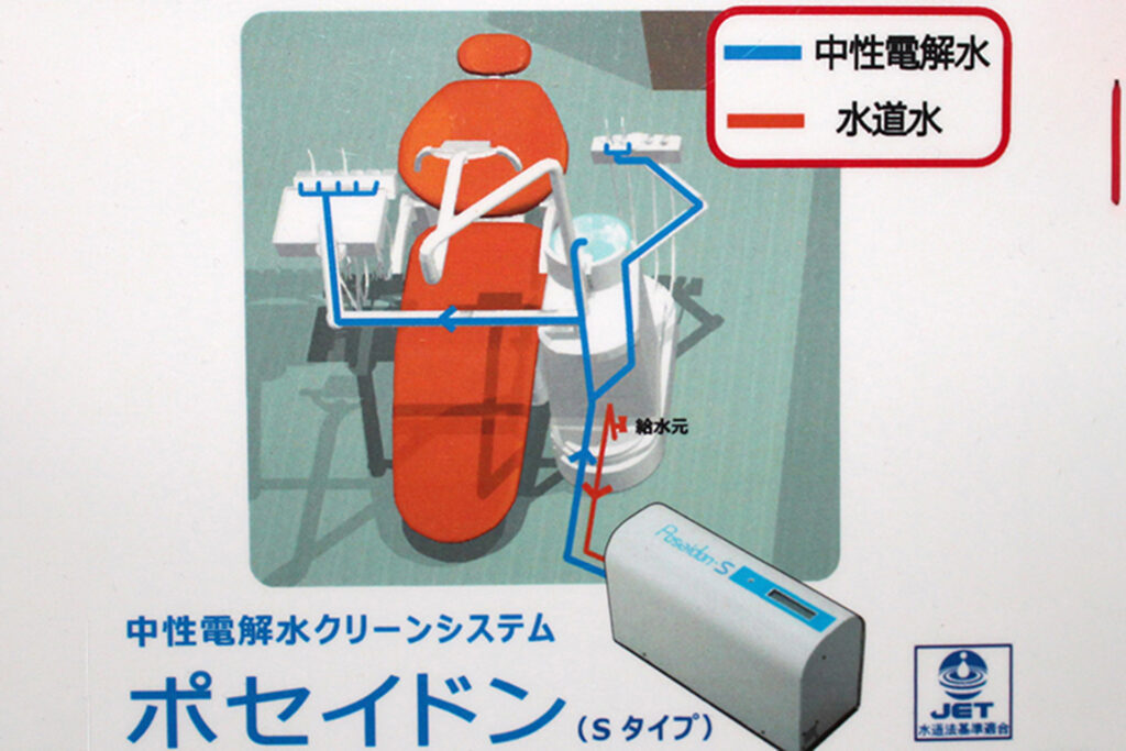 より衛生的な「お水」で治療を受けていただくために当医院で治療に使用するお水は、中性電解 水クリーンシステム『ポセイドン』により、常に衛生的な状態に保たれています。『ポセイドン』は、人と自然に優しい中性電解水を歯科ユニットに通水させることにより、水配管 内の細菌などの繁殖を抑え、治療環境を衛生的に保つシステムです。