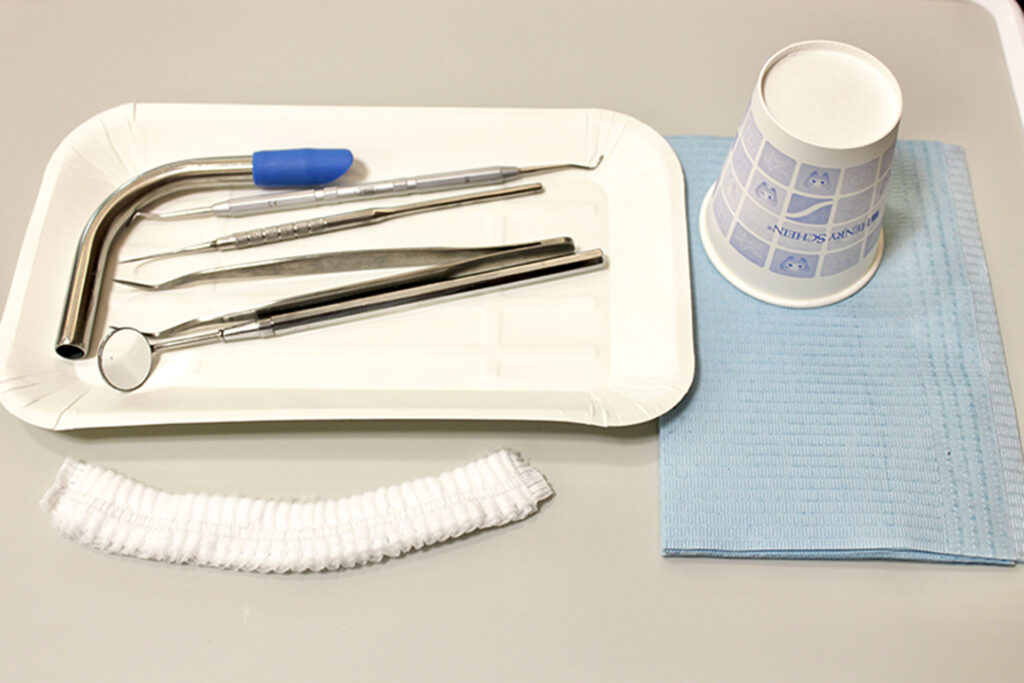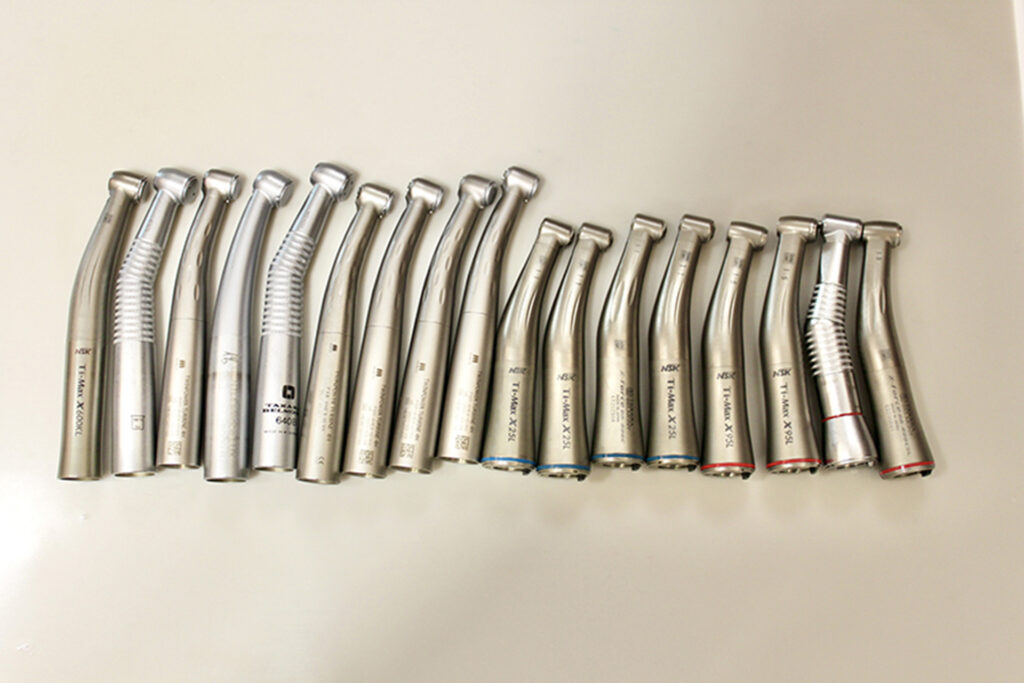 エプロン、うがい用コップ、診療の基本器具を乗せるトレー、ヘッドレストカバーなど、患者さまそれぞれが触れるものは全て使い捨てです。歯を削る器具、機器は患者さんごとに完全滅菌されたものを交換して使用しています。