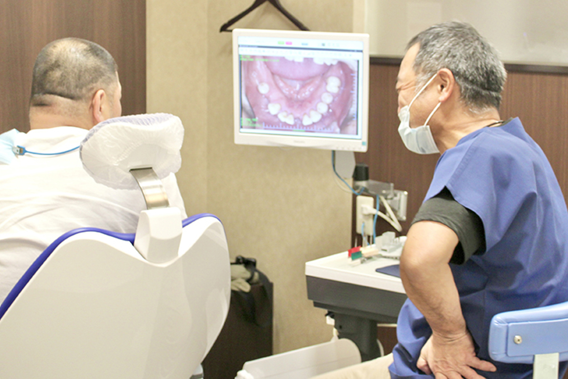 まずは患者さん自身が自分の歯や口の中の状態を知り、さらに興味を持つことが大事です。当院では開院以来、口腔内写真やレントゲン画像を使って現状を「見せる」ことを重要視しています。手鏡だけで口の中を見せられてもなかなかわからないものですが、口腔内写真を見ればすぐに納得できるものも多くあります。困っている部位の状態や原因、治療法についても、鮮明な写真や画像と一緒に説明を受けることで、より理解が得られるはずです。